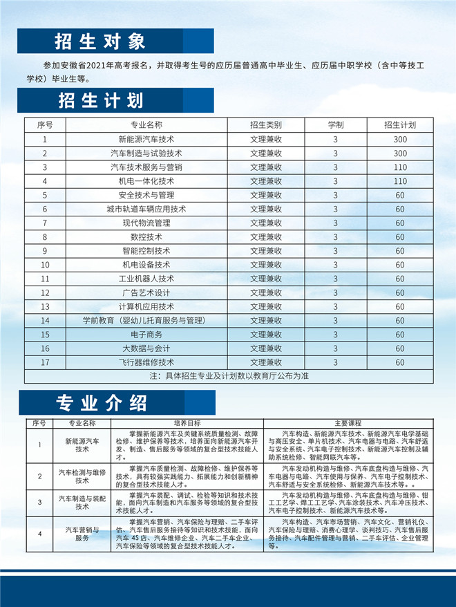 安徽汽車職業(yè)技術(shù)學院2021年分類考試招生章程