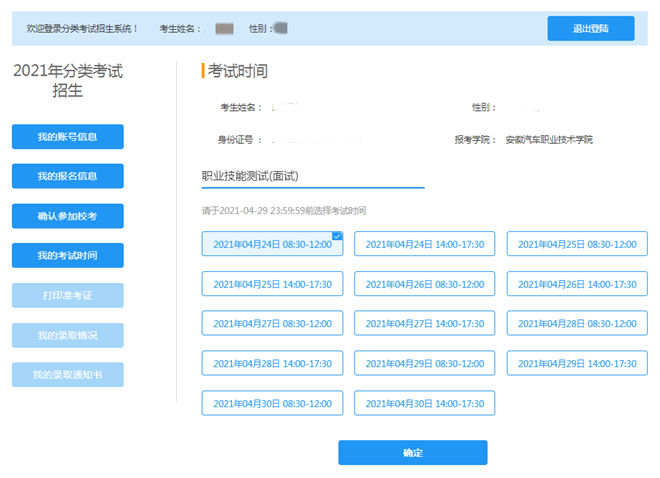 七、根據(jù)自己的安排選擇一個(gè)時(shí)間段,并點(diǎn)擊“確定”。