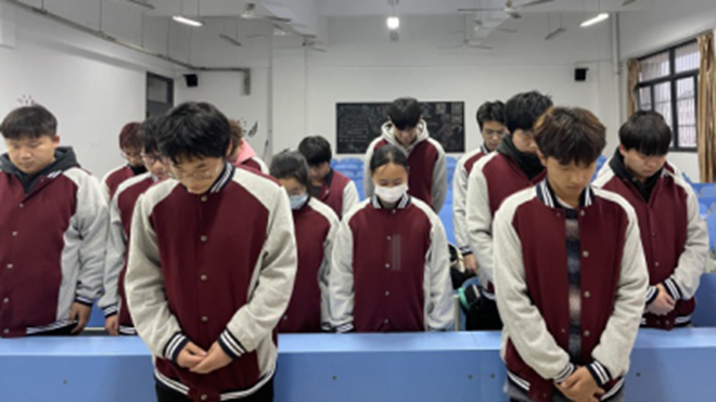 演講結(jié)束后,全體師生垂首肅立,為死難同胞沉痛默哀一分鐘。