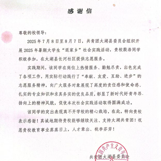 近日,我校收到共青團(tuán)太湖縣委員會(huì)發(fā)來(lái)的感謝信,信中對(duì)我校學(xué)子殷浩在2025年暑期大學(xué)生返家鄉(xiāng)社會(huì)實(shí)踐活動(dòng)中的突出表現(xiàn)給予高度肯定與誠(chéng)摯贊揚(yáng),為我校人才培養(yǎng)成果再添一抹亮色。