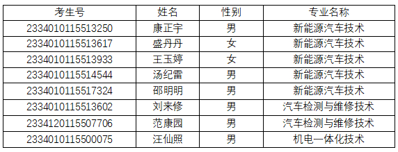 安徽汽車職業(yè)技術(shù)學(xué)院2023年12月錄取的繼續(xù)教育??茖W(xué)生中,有少數(shù)學(xué)生未按我院要求及時報到、注冊。經(jīng)我院通過多種渠道、多次與學(xué)生聯(lián)系后,至今仍有8名學(xué)生未履行報到、繳費及注冊手續(xù),也未向我院提交任何請假或保留入學(xué)資格申請。根據(jù)《普通高等學(xué)校學(xué)生管理規(guī)定》(中華人民共和國教育部令第41號)和《安徽汽車職業(yè)技術(shù)學(xué)院繼續(xù)教育學(xué)生學(xué)籍學(xué)歷管理規(guī)定》等文件精神,對以下8名學(xué)生做放棄入學(xué)資格處理,現(xiàn)予以公示。