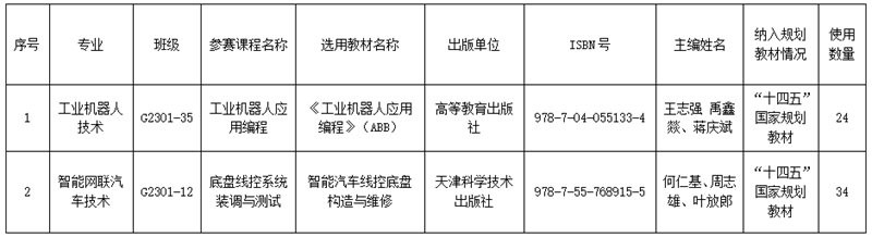 依據(jù)《2025年安徽省高等職院校教學(xué)能力大賽方案》 關(guān)于教材選用說明相關(guān)要求,2025年安徽省高等職業(yè)院校教學(xué)能力大賽安徽汽車職業(yè)技術(shù)學(xué)院參賽課程教材選用、使用情況公示如下: