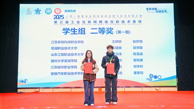 11月7日至9日,2025年一帶一路暨金磚國家技能與技術創(chuàng)新大賽——第三屆工業(yè)互聯(lián)網網絡互聯(lián)技術賽項全國總決賽在山東舉行。我校智能制造系和信息工程系聯(lián)合組隊參賽,在全國132支隊伍的激烈角逐中勇創(chuàng)佳績,斬獲全國一等獎1項、二等獎1項,學校榮獲全國“最佳組織獎”。