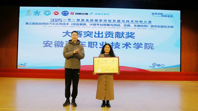 為保障賽事順利開展,作為聯(lián)合承辦單位的安徽汽車職業(yè)技術(shù)學(xué)院,在各級領(lǐng)導(dǎo)的關(guān)心指導(dǎo)下,在組委會的統(tǒng)籌協(xié)調(diào)下,在各合作企業(yè)、兄弟院校和全體志愿者的通力協(xié)作下,全力做好賽事組織、技術(shù)保障和后勤服務(wù)工作,努力營造公平、公正、公開的競賽環(huán)境,確保大賽順利、高效、圓滿舉行,榮獲本次大賽“突出貢獻(xiàn)獎”。