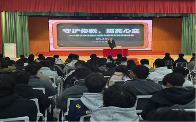 為強化學生心理委員專業(yè)能力,織密校園心理防護網(wǎng)絡,11月18日晚,由我校大學生心理健康教育中心主辦的《守護你我,照亮心空 —— 學生心理危機識別與朋輩互助團體輔導》專題講座順利舉行。全校各班班長、心理委員等學生代表齊聚一堂,共同參與這場兼具理論深度與實踐價值的心靈賦能之旅。本次講座特邀合肥四十八中學教育集團西遞中學副校長管以東擔任主講專家,我校學生處副處長王文君、黨政辦公室行政科科長袁金全出席活動,講座由心理健康教育中心老師主持,為活動專業(yè)性與實效性提供有力保障。