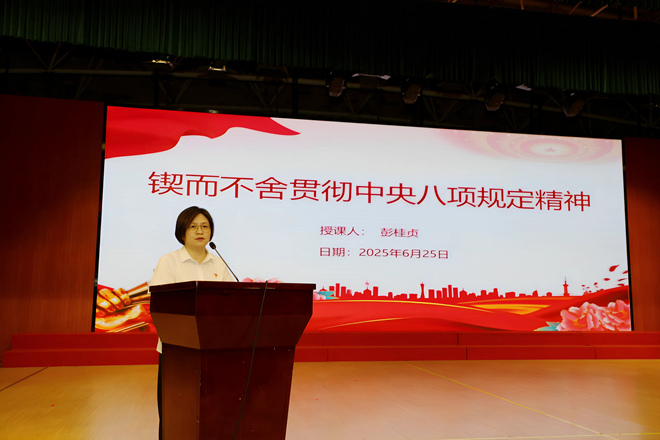 彭桂貞為與會人員講授《鍥而不舍貫徹中央八項規(guī)定精神》專題黨課,她全面回顧了學校黨委深入貫徹中央八項規(guī)定精神學習教育開展情況,闡述了深入貫徹中央八項規(guī)定精神學習教育背景、中央八項規(guī)定及中央八項規(guī)定精神主要內(nèi)容、違反中央八項規(guī)定精神問題類型及表現(xiàn)、通報了3起發(fā)生在省內(nèi)及教育領(lǐng)域的違反中央八項規(guī)定精神典型案例。要求全體黨員干部切實以案為鑒、受警醒、知敬畏、守底線。