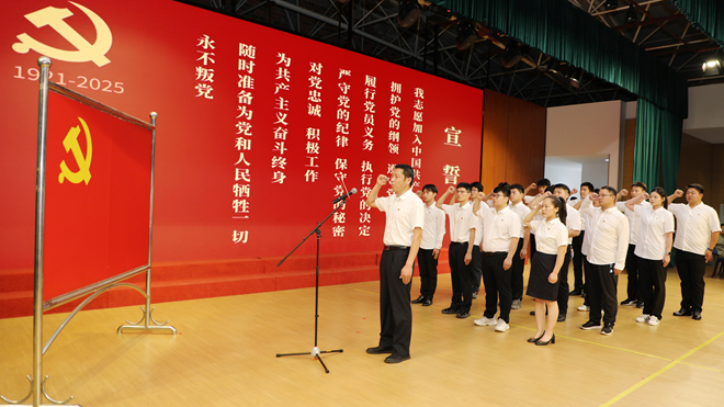 在黨委委員盧正寶的領(lǐng)誓下,新黨員宣誓和黨員重溫入黨誓詞。