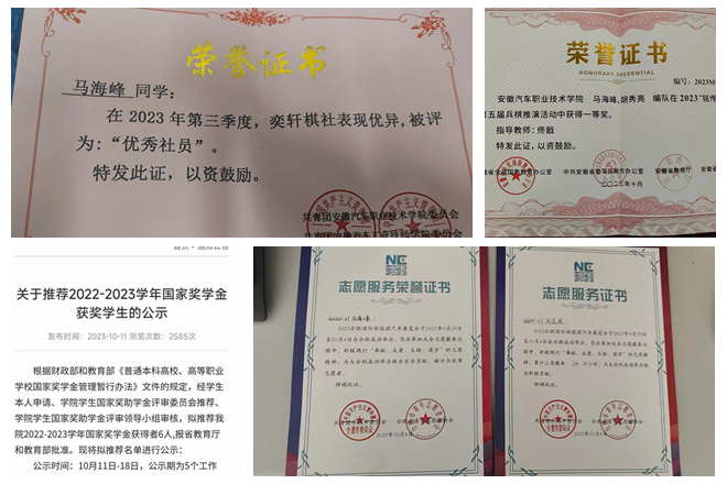 漫途之行,他也在努力成為一名德智體美勞健全的優(yōu)秀大學(xué)生.他積極參加學(xué)校的各種活動(dòng),獲得了2023年安徽省職業(yè)技能大賽“軌道車輛技術(shù)”三等獎(jiǎng),2023年“銘傳杯”安徽省第五屆兵棋推演活動(dòng)一等獎(jiǎng),協(xié)助拍攝獲得2023年安徽省高等職業(yè)院?!敖虒W(xué)能力大賽”一等獎(jiǎng),2023年校園”互聯(lián)網(wǎng)+創(chuàng)新創(chuàng)業(yè)“大賽三等獎(jiǎng),2023年合肥國際新能源汽車展覽會(huì)志愿服務(wù)榮譽(yù)證書。